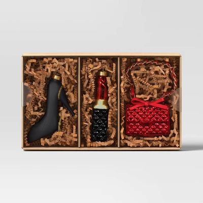 Surprise a fashionista with the 3-Piece Gift Ornament Set Glass Fashionista from Wondershop™. This three-piece Christmas ornament set includes a pair of heel sandals, lipstick, and a purse, neatly packed in a box to make it a perfect Christmas gift for yourself or a loved one. Designed for indoor use, these pieces feature built-in loops for easy display on a tree.