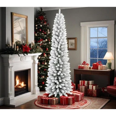 Bring the calm of winter indoors with the Acekool Snow Flocked Pencil Tree, designed to offer a seasonal accent in both large and compact spaces. Each slender branch is layered with flocking for a realistic snowy finish, setting a festive mood and creating a welcoming backdrop for your seasonal gatherings or everyday family moments.The slim pencil profile is great for placement in tight corners, hallways, or apartments. Flexible, bendable PVC branch tips allow easy shaping, helping you arrange your ornaments, garlands, and other accents your way. This tree stands on a sturdy, foldable base with covers to help protect floor surfaces and ensure the tree remains upright and secure.Acekool flocked pencil trees are available in 6ft, 7.5ft, 9ft, and 12ft sizes to match both small and large areas. Assembly is straightforward—just connect, shape, and dress the tree as you like. The space-saving design helps maximize your holiday décor, bringing seasonal charm wherever it stands. Enjoy the blend of realistic snow flocking, convenient assembly, and flexible size selection to match your style and room layout.