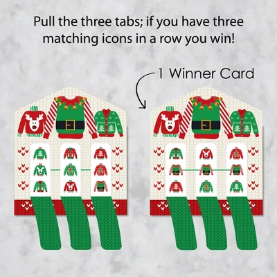 Ugly Sweater Pull Tabs 3-in-a-Row INCLUDES 12 pull tab game cards with 1 winning card and 11 losing cards. Great for a Holiday or Christmas Party, these game cards are for entertainment purposes only. FUN FOR ALL: The Ugly Sweater 3-in-a-Row pickle cards can be played by children and adults. It’s the perfect way to add excitement to your event! Prize is determined by the event host. HOW TO PLAY: Hand out one Pull Tab Game Card to each player. Players will then pull each tab open along the perforated lines. If there are three matching icons in a row, the player wins! HIGH-QUALITY: Ugly Sweater Pull Tabs 3-in-a-Row Cards are professionally printed double-sided on sturdy cardstock paper with a photo-like shine. They are individually inspected and carefully packaged by hand. MADE IN THE USA: Ugly Sweater Pull Tabs 3-in-a-Row is designed and manufactured at our Wisconsin facility using materials that are Made in the USA.