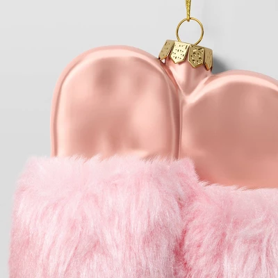 Decorate your tree this holiday season with the Christmas Glass Slippers Ornament from Wondershop™. Made from glass, this Christmas tree ornament is shaped like house slippers with sparkly uppers and faux fur trim in a soft pink hue for the perfect cozy look. Easy to coordinate with a variety of other holiday tree ornaments, the slippers ornament is topped with a golden crown and an attached loop that makes it easy to hang from your Christmas tree.