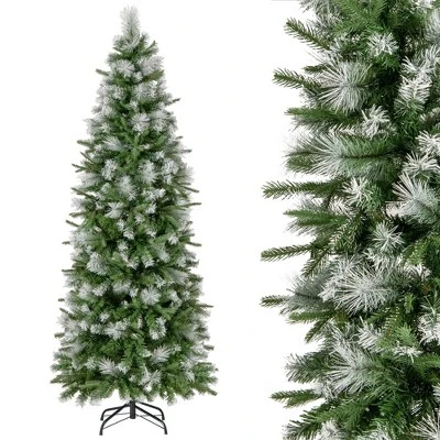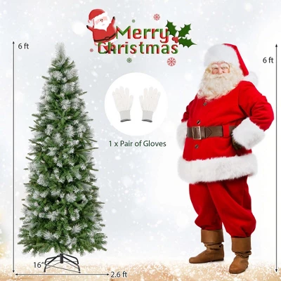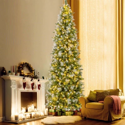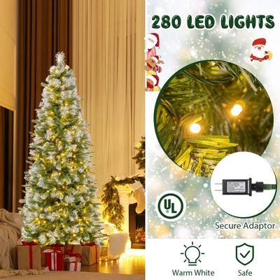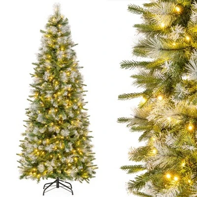 With 580/820/1228 realistic branch tips and a flocked design, the 6/7.5/9 ft Xmas tree offers a snowy, lifelike appearance. Crafted from superior materials, the Christmas tree stays vibrant as a living tree and ensures safety with non-allergic and fireproof features. Illuminate your holidays with 280/350/470 warm white LED lights that can ensure using safety and durability. The clever hinged design allows branches to expand automatically. Coupled with included gloves, the assembly of the 3/3/4-section decoration tree becomes convenient and safe. The sturdy metal stand with anti-slip pads provides a secure display. The decoration tree can stand upright in different places according to your preference. Merry Christmas!