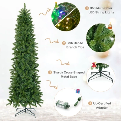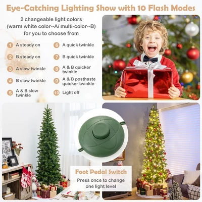 Our 6 ft/ 7.5 ft pre-lit Christmas tree can be a perfect addition to your home, office, school, store, and holiday parties, immersing you and your family in the warmth of festivals. Comes with thick branch tips and vivid green needles, the Xmas tree looks lush and vivid. And thanks to the slim pencil design, it can fit small corners and fill small places full of festival spirits. More than that, our tree is equipped with 270/350 LED lights shining the warm white and multi-color, which have 10 lighting modes, and you can choose any mode you like to transform the atmosphere of your home as you want. Besides, our Xmas tree is made of high-quality PVC and PE material, which is non-flammable for safe use. And thanks to the hinged structure and foldable metal stand, the artificial Christmas tree is effortless to set up and take down.