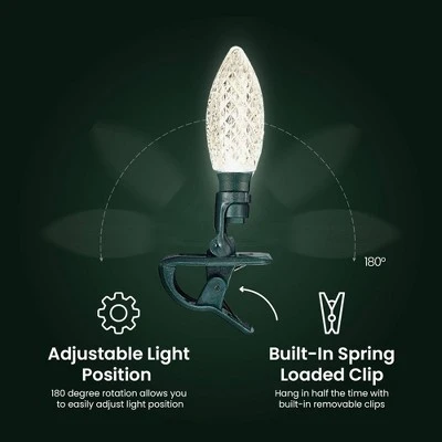Spend less time hanging lights and more time celebrating with your family and friends this holiday season with the 4-pack of NOMA Quick Clip Durable Diamond Cut C9 LED Holiday Outdoor Christmas Lights.These holiday lights feature the Quick Clip Technology. With its built-in spring-loaded clips, you can decorate your home in half the time it traditionally takes. The 100 LED bulbs are a highlight, radiating a warm and inviting glow that will make your home the talk of the town during the holiday season. Not only do they create a festive ambiance, but they’re also energy-efficient so that you can enjoy the brilliance without the guilt. With a remarkable lifespan of 10,000 hours, these LED outdoor string lights are designed to last for many joyful holiday seasons.Gone are the days of fumbling with nails and staples, as these lights can be securely attached to branches, rooflines, and railings without causing any damage to your home’s exterior. Each LED light can be rotated 180 degrees, so you can place each diamond-cut style light exactly where you desire. With durable C9 bulbs featuring weather-sealed sockets, they are built to withstand harsh winter weather conditions.These outdoor LED Christmas lights have everything you need to bring warmth and festivity to your home during the holidays. Let the season shine brighter than ever before with these (4) NOMA Quick Clip Durable Diamond Cut C9 LED Holiday Outdoor Christmas Lights.